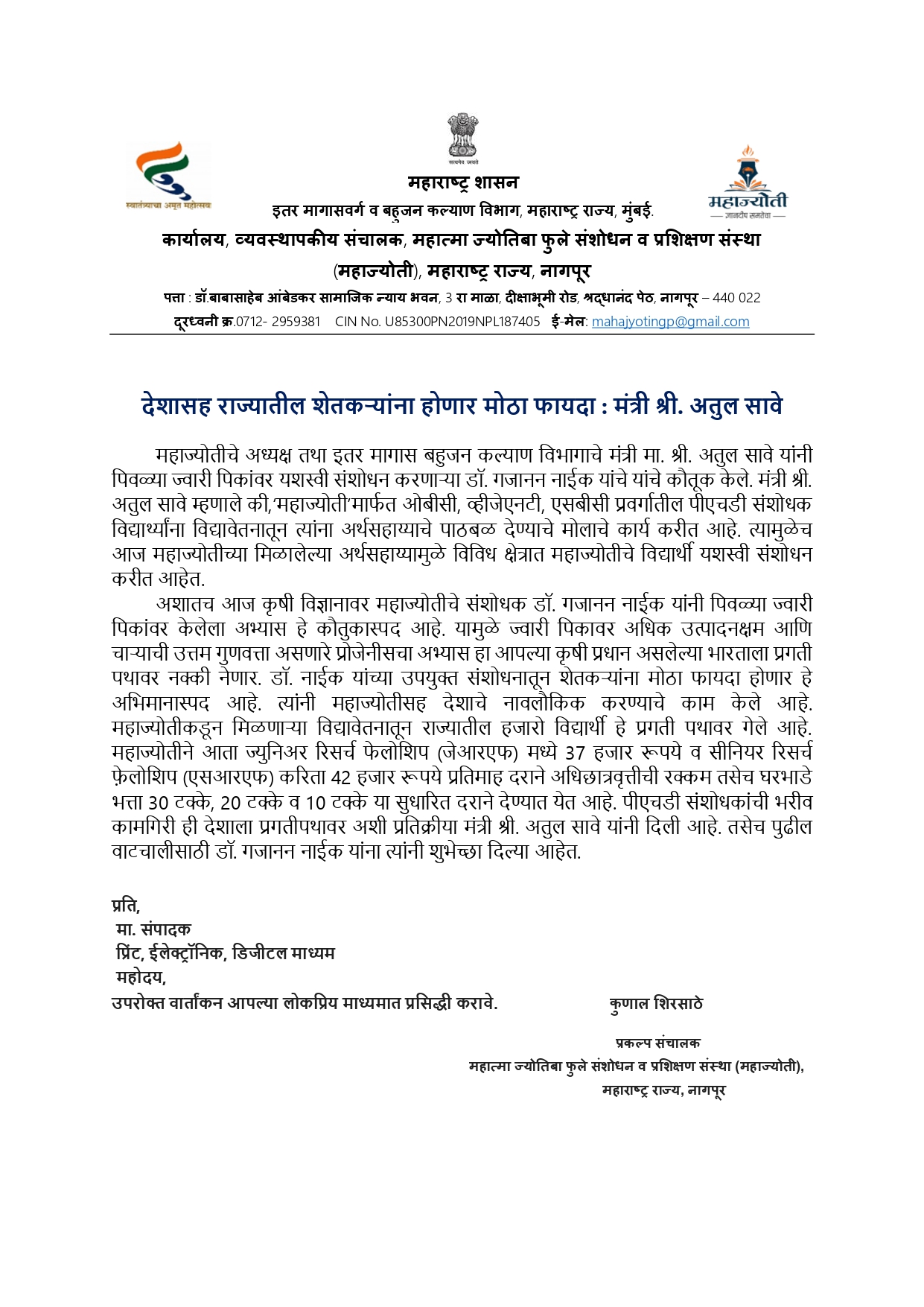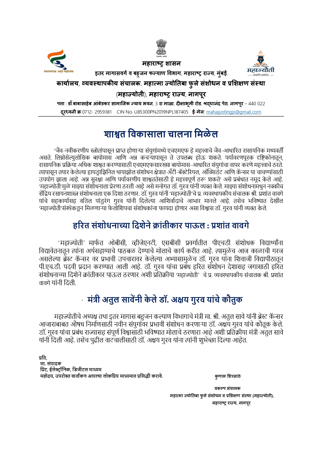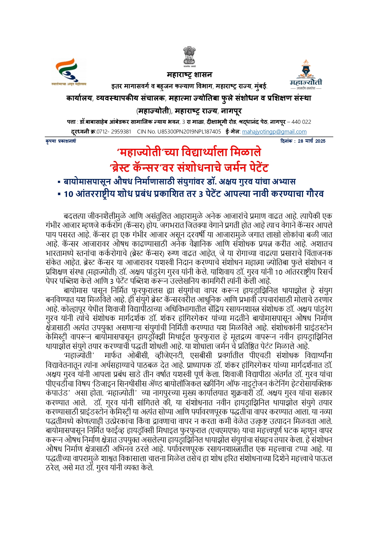 महाज्योती च्या विद्यार्थ्याला मिळाले ‘ब्रेस्ट कॅन्सर’वर संशोधनाचे जर्मन पेटेंट
