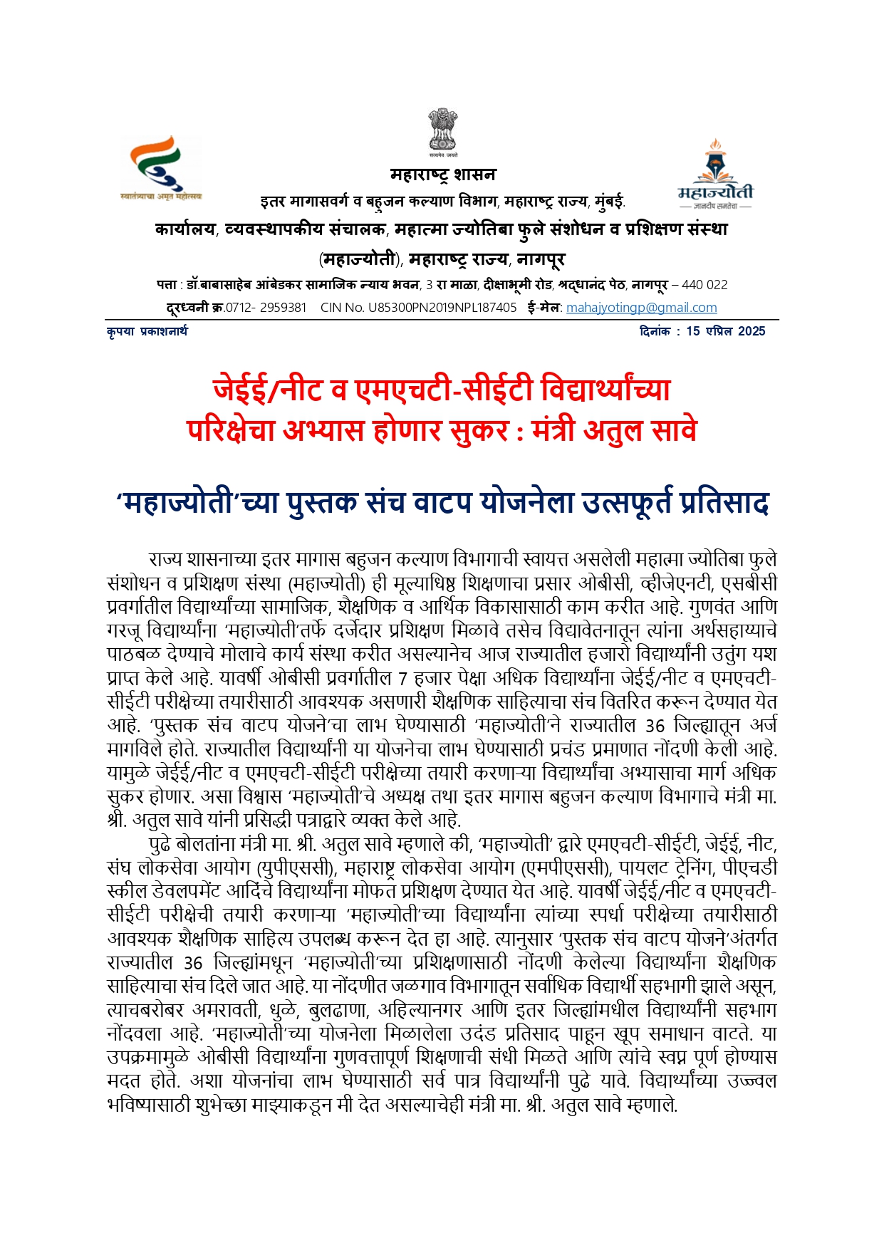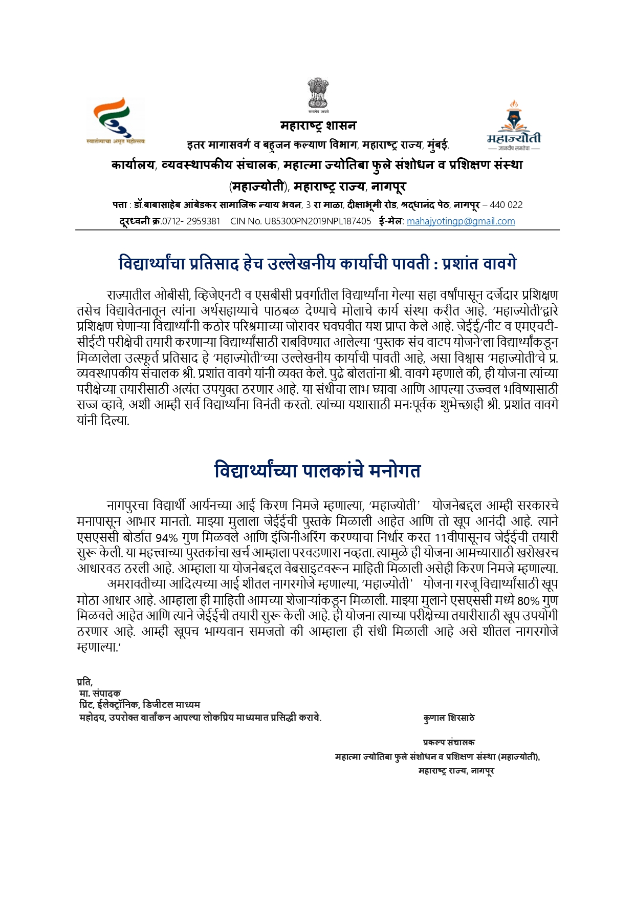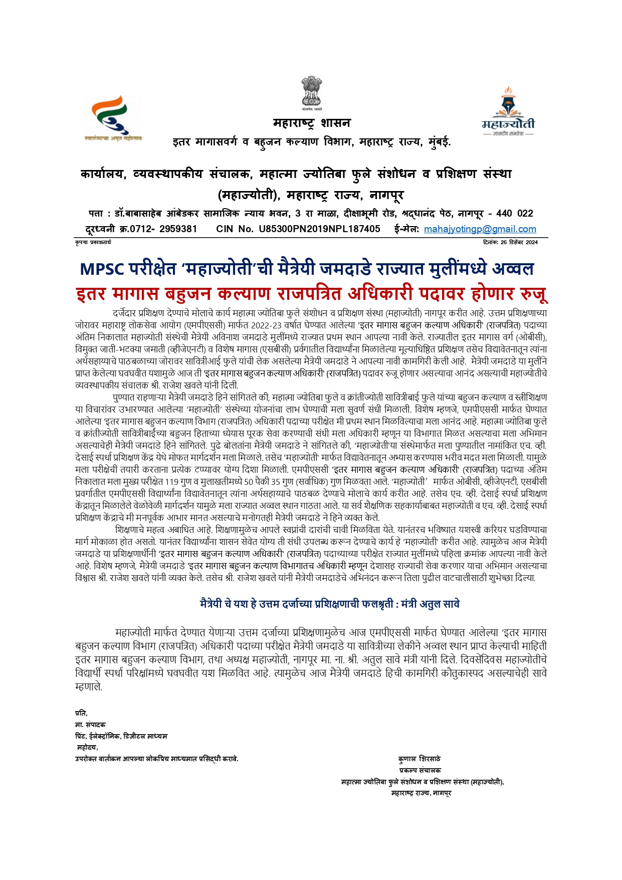 सब रजिस्टार व एसटीआय पदावर महाज्योतीच्या 15 विद्यार्थ्यांची निवड