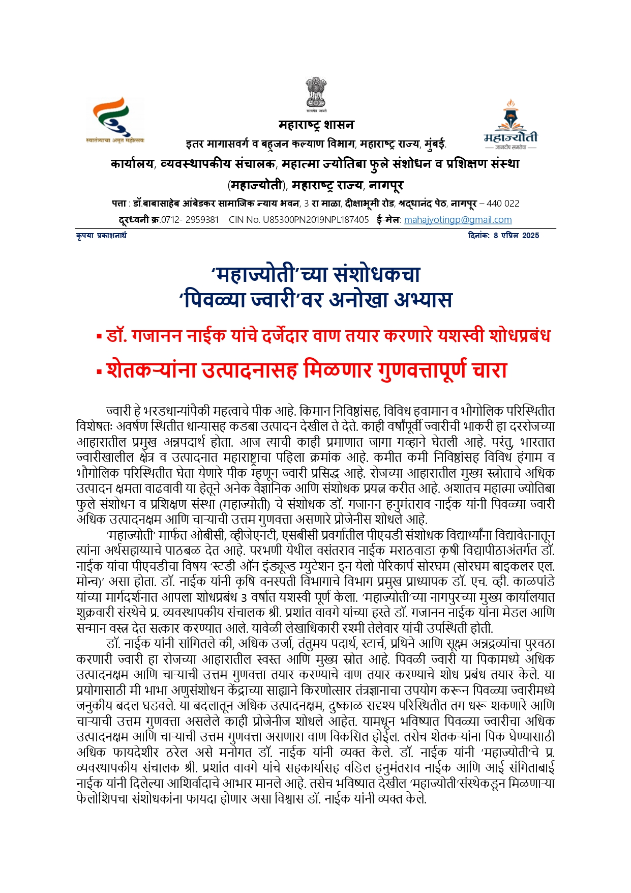 महाज्योती’च्या संशोधकचा पिवळ्ळ्या ज्वारीवर अनोखा अभ्यास
