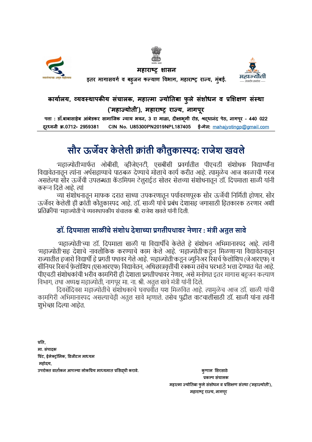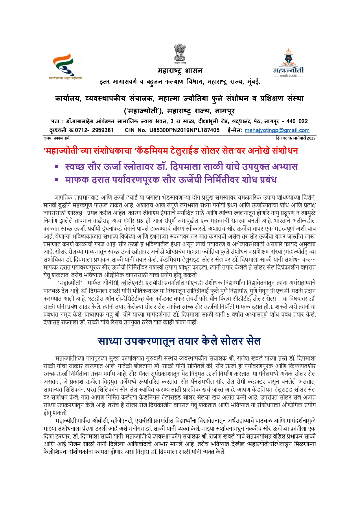 महाज्योती च्या संशोधकाचा कॅडमियम टेतुराईड सोलर सेल वर अनोखे संशोधन