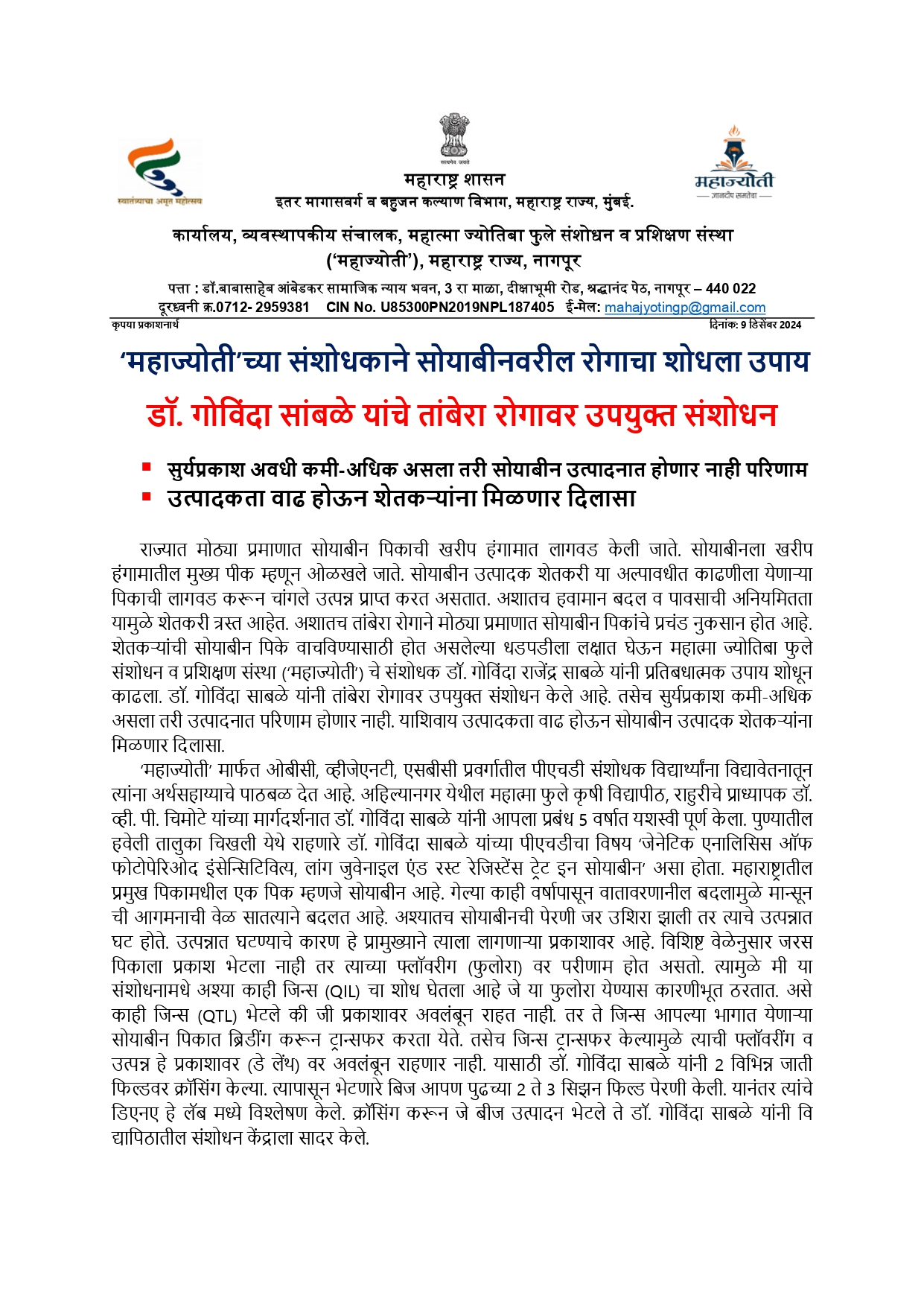 महाज्योतीच्या संशोधकाने सोयाबीनवरील रोगाचा शोधला उपाय