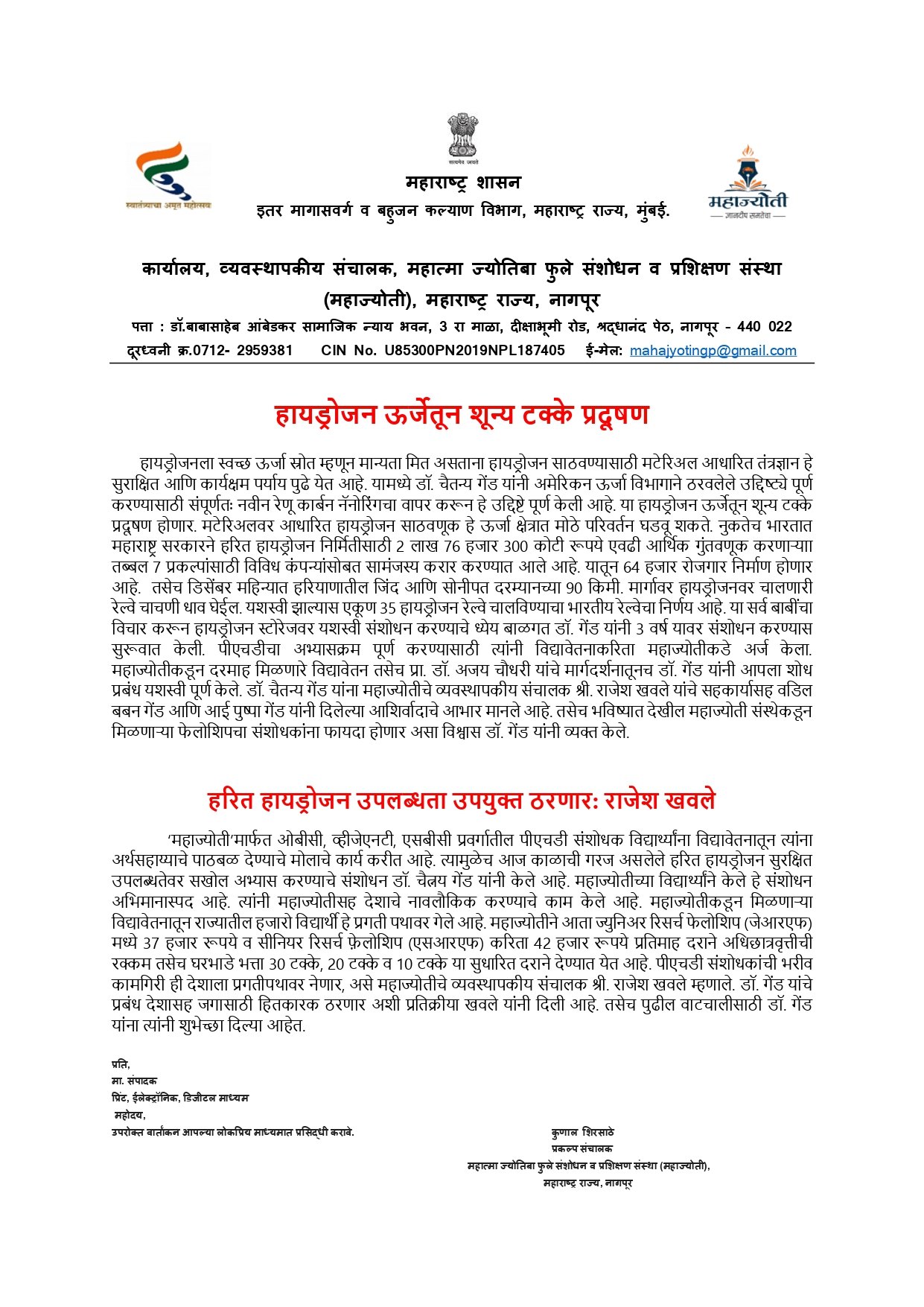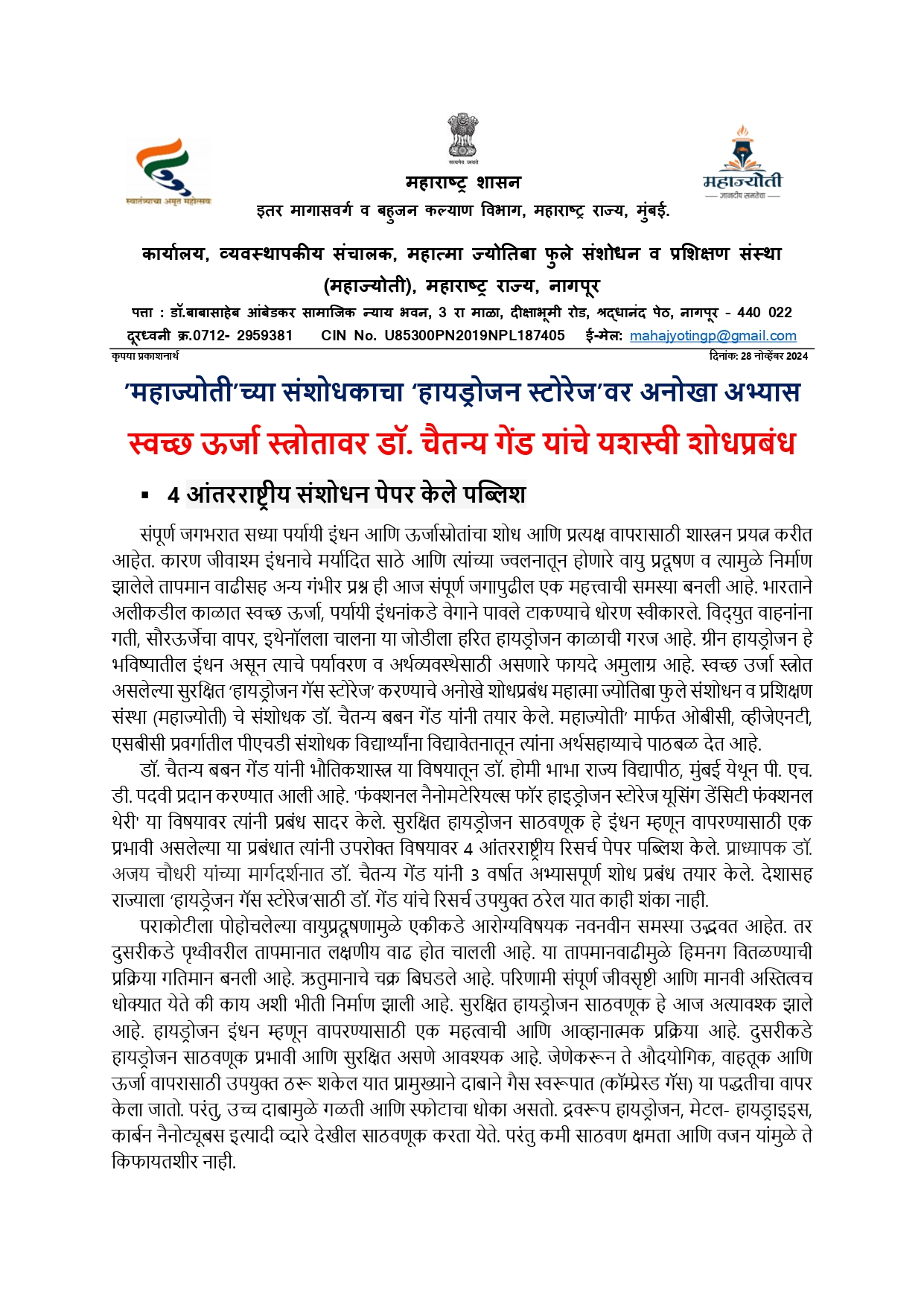 महाज्योतीच्या संशोधकाचा हायड्रोजन स्टोरेजवर अनोखा अभ्यास स्वच्छ ऊर्जा स्त्रोतावर डॉ. चैतन्य गेंड यांचे यशस्वी शोधप्रबंध
