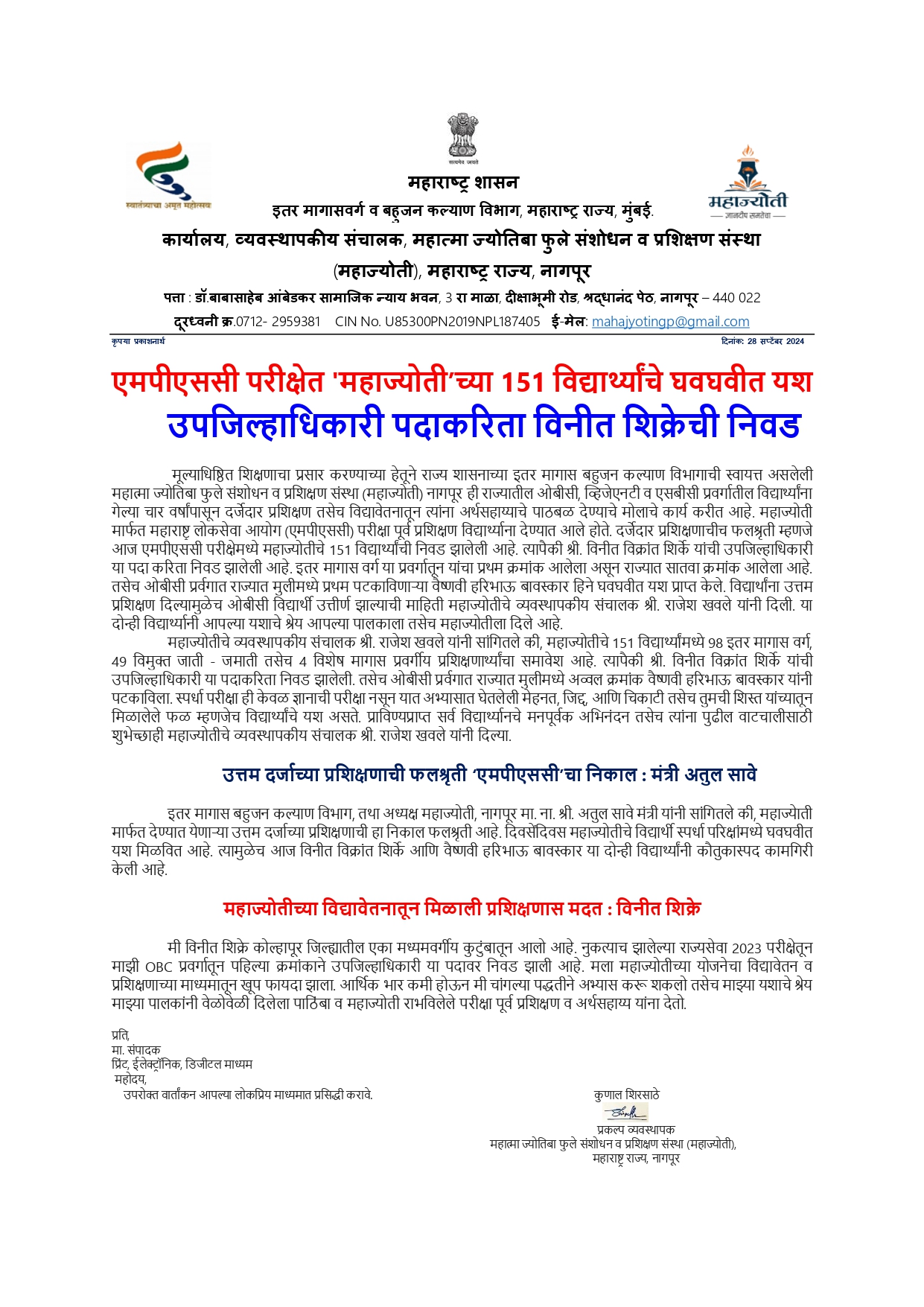 एमपीएससी परीक्षेत महाज्योतीच्या 151 विद्यार्थ्यांचे घवघवीत यश उपजिल्हाधिकारी पदाकरिता विनीत शिक्रेची निवड