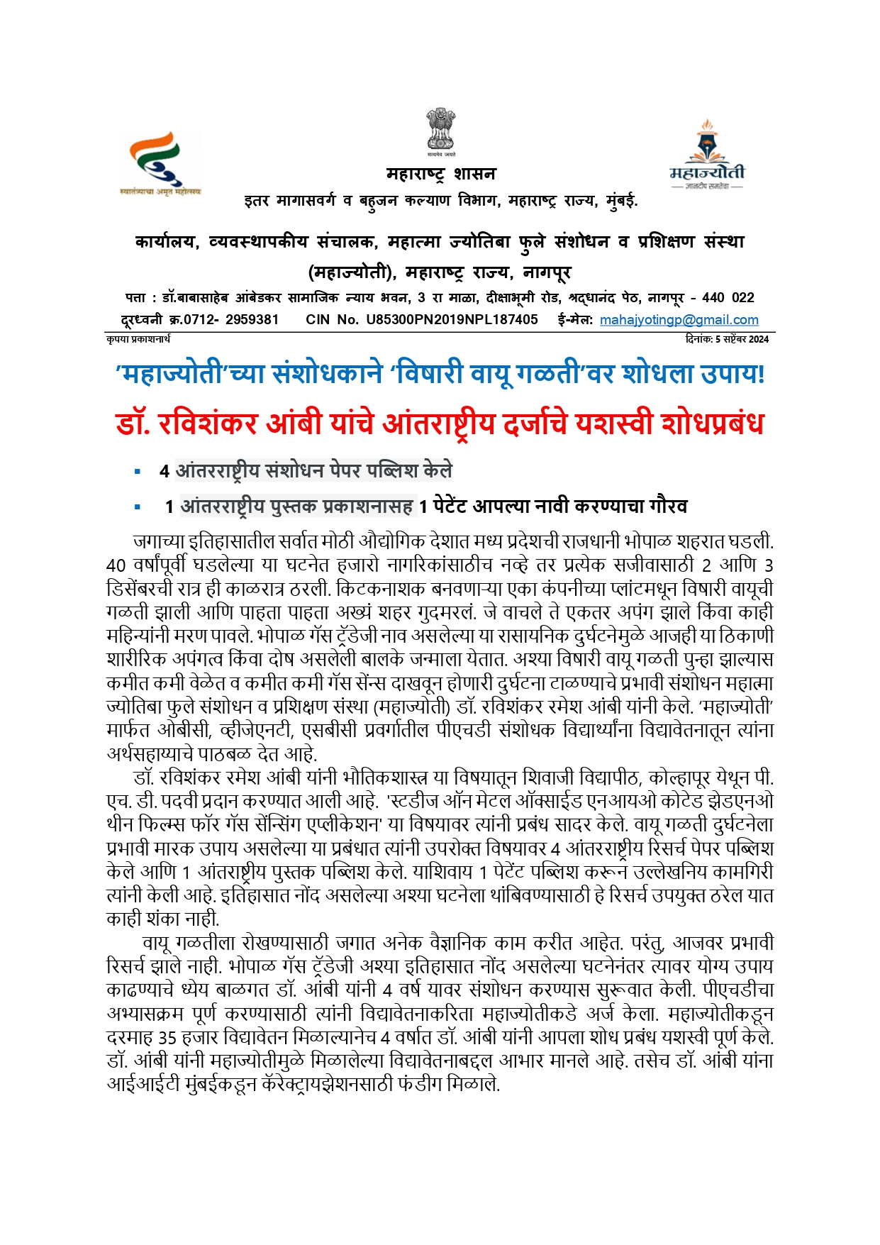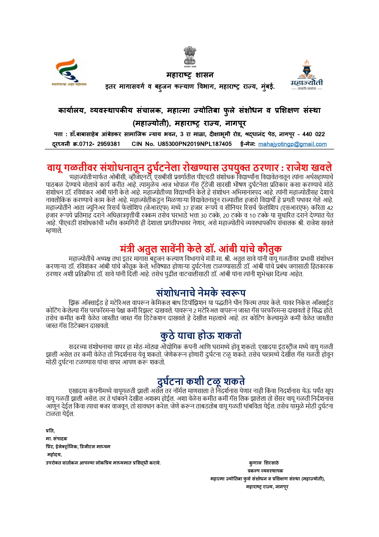 महाज्योती च्या संशोधकाने ‘विषारी वायू गळती’वर शोधला उपाय !