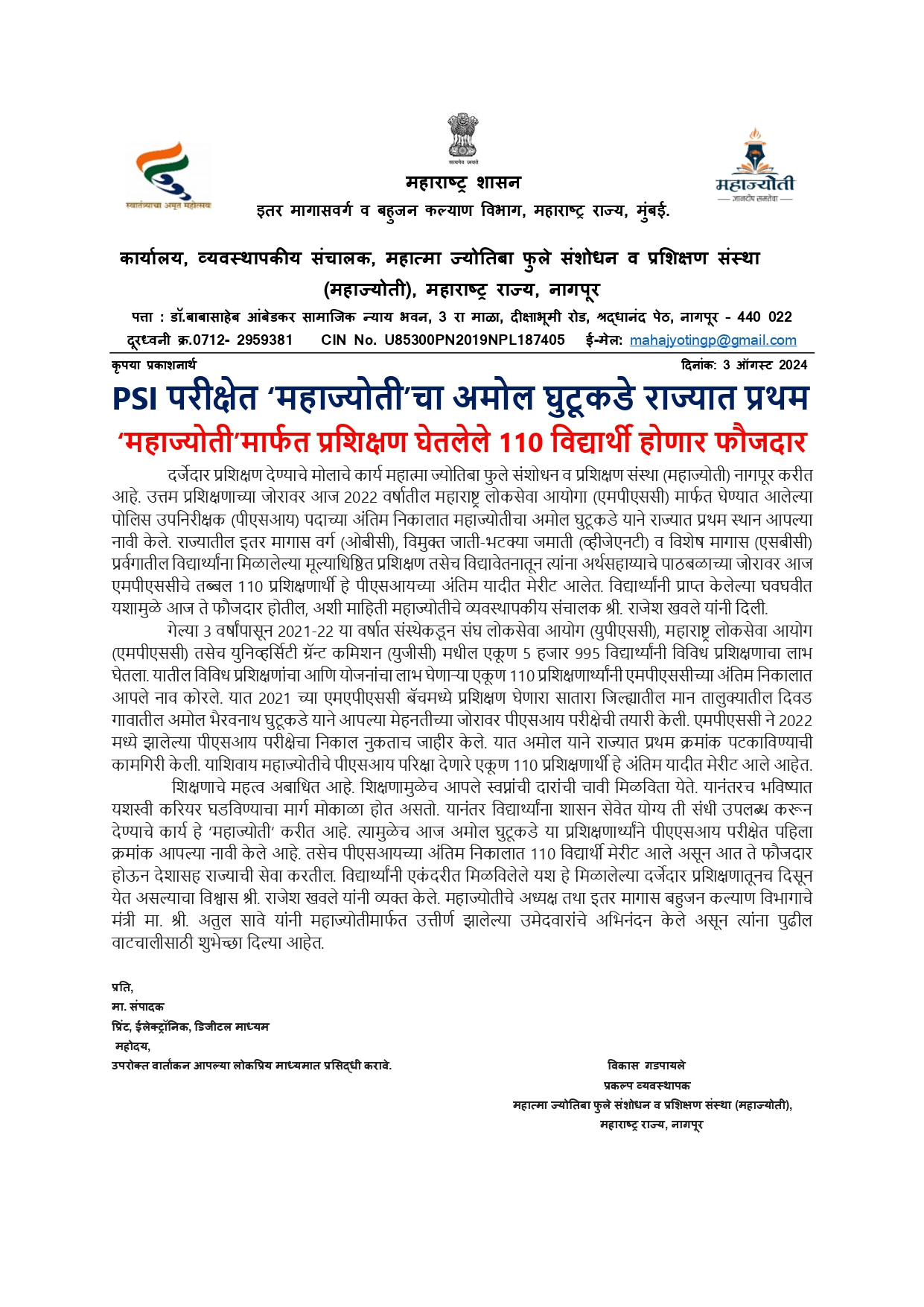 PSI परीक्षेत महाज्योतीचा अमोल घुटूकडे राज्यात प्रथम