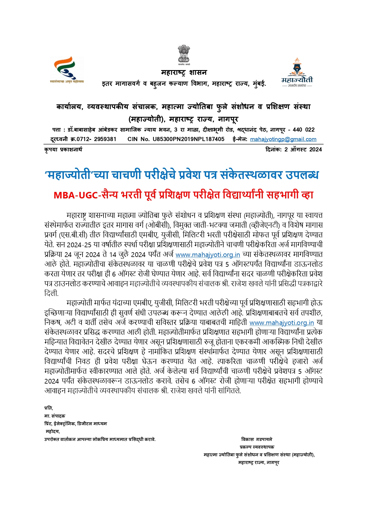 महाज्योतीच्या चाचणी परीक्षेचे प्रवेश पत्र संकेतस्थळावर उपलब्ध