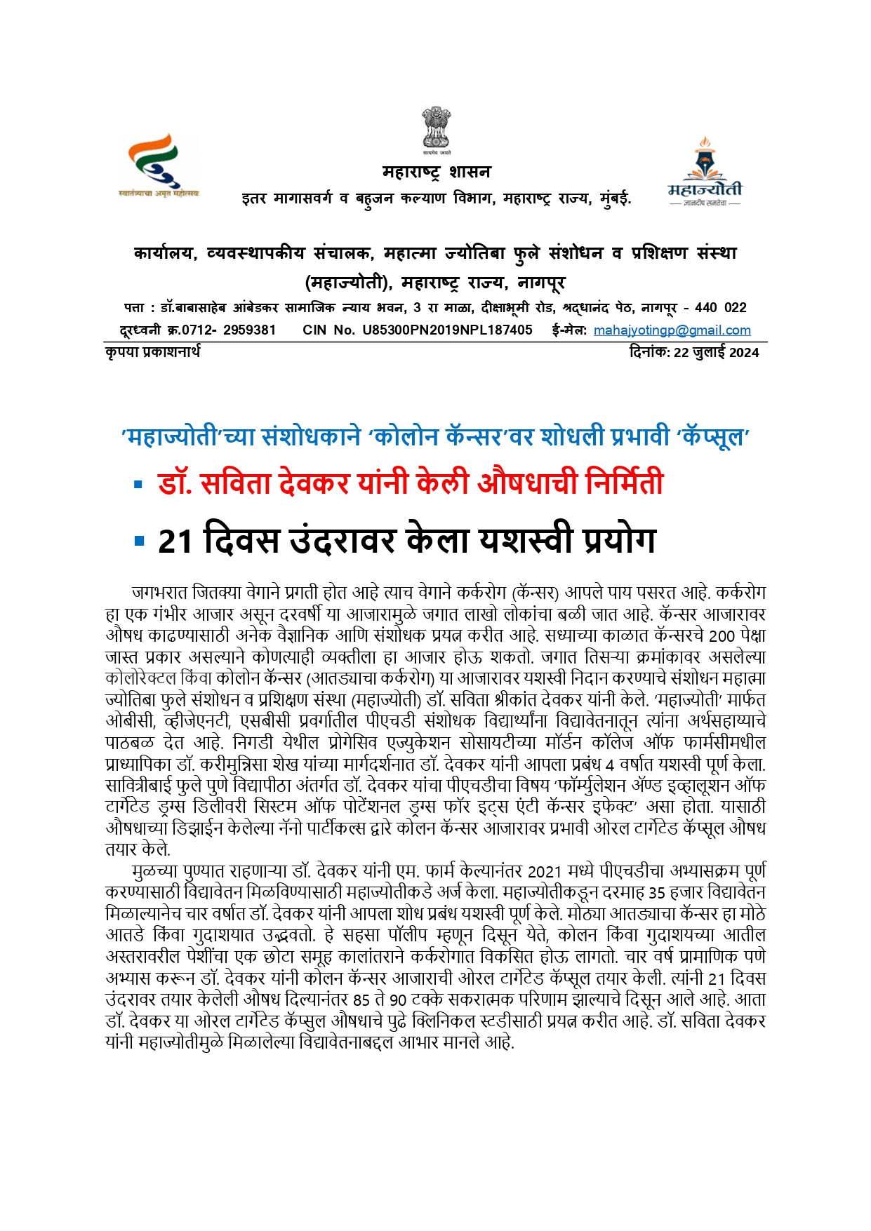 महाज्योतीच्या संशोधकाने कोलोन कॅन्सर_वर शोधली प्रभावी कॅप्सूल