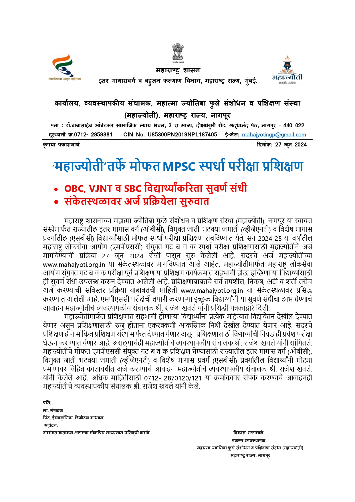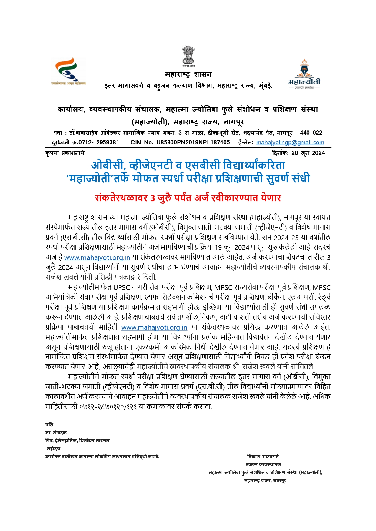 ओबीसी, व्हीजेएनटी व एसबीसी विद्यार्थ्यांकरिता महाज्योती तर्फे मोफत स्पर्धा परीक्षा प्रशिक्षणाची सुवर्ण संधी