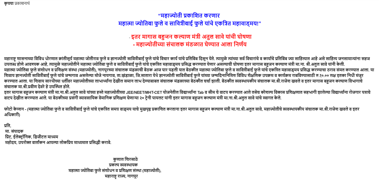 महाज्योती वैमानिक प्रशिक्षण बातमी प्रसिध्द करण्याबाबत