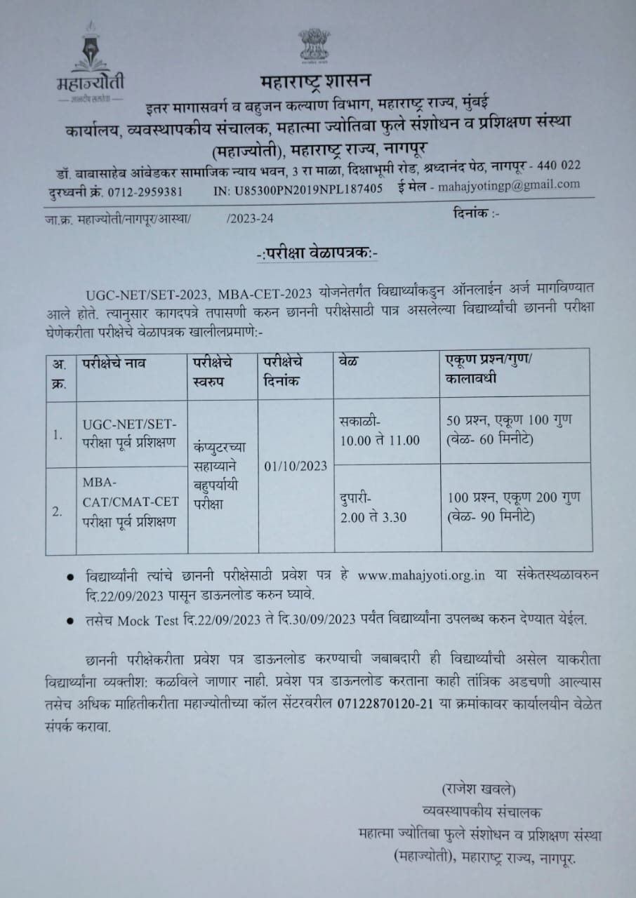 महात्मा ज्योतिबा फुले संशोधन अधिछात्रवृत्ती २०२३ करिता दि २४.१२.२०२३ च्या परीक्षेबाबत