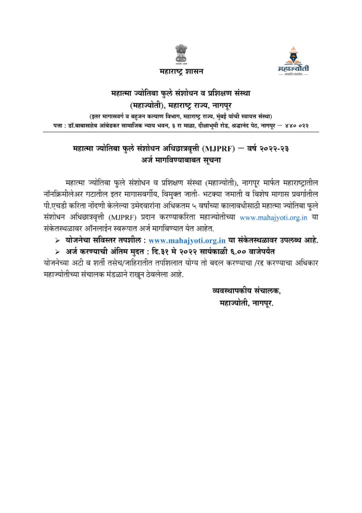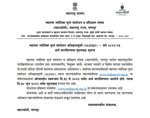 महात्मा ज्योतिबा फुले संशोधन अधिछात्रवृत्ती (MJPRF) – वर्ष 2022-23