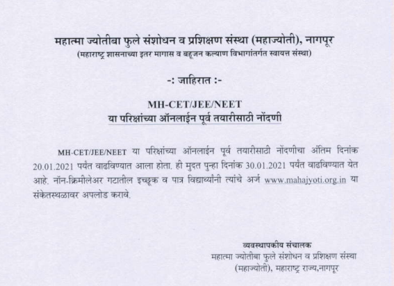 सन २०२२ मध्ये होणाऱ्या JEE/MH-CET/NEET या परीक्षांच्या ऑनलाईन/ऑफलाईन पुर्वतयारी साठी इतर मागासवर्ग,विमुक्त जाती व भटक्या जमाती, विशेष मागासप्रवर्ग, आणि धनगर या समाज घटकातील क्रिमिलेयर गटा मध्ये नसलेल्या इयत्ता ११ वी मध्ये प्रवेश घेतलेल्या इच्छूक व पात्र विद्यार्थ्यांनी करावयाच्या अर्जाचा नमुना.